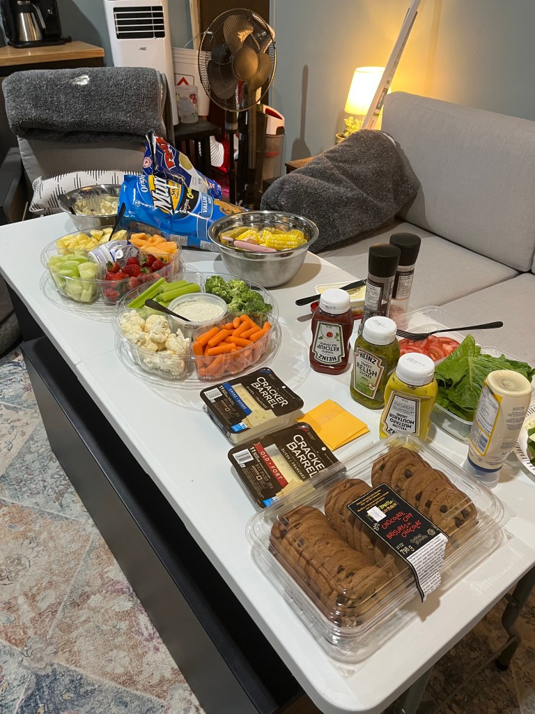 We cleared space in the garage-turned-temporary-kitchen, unfolded a white plastic table, and began to lay things out: burgers, beef and chicken, fresh off the grill, corn still warm from the pot, crisp veggies, juicy fruit, potato salad, chips, cookies, cold drinks. Nothing fancy. Everything offered with care.